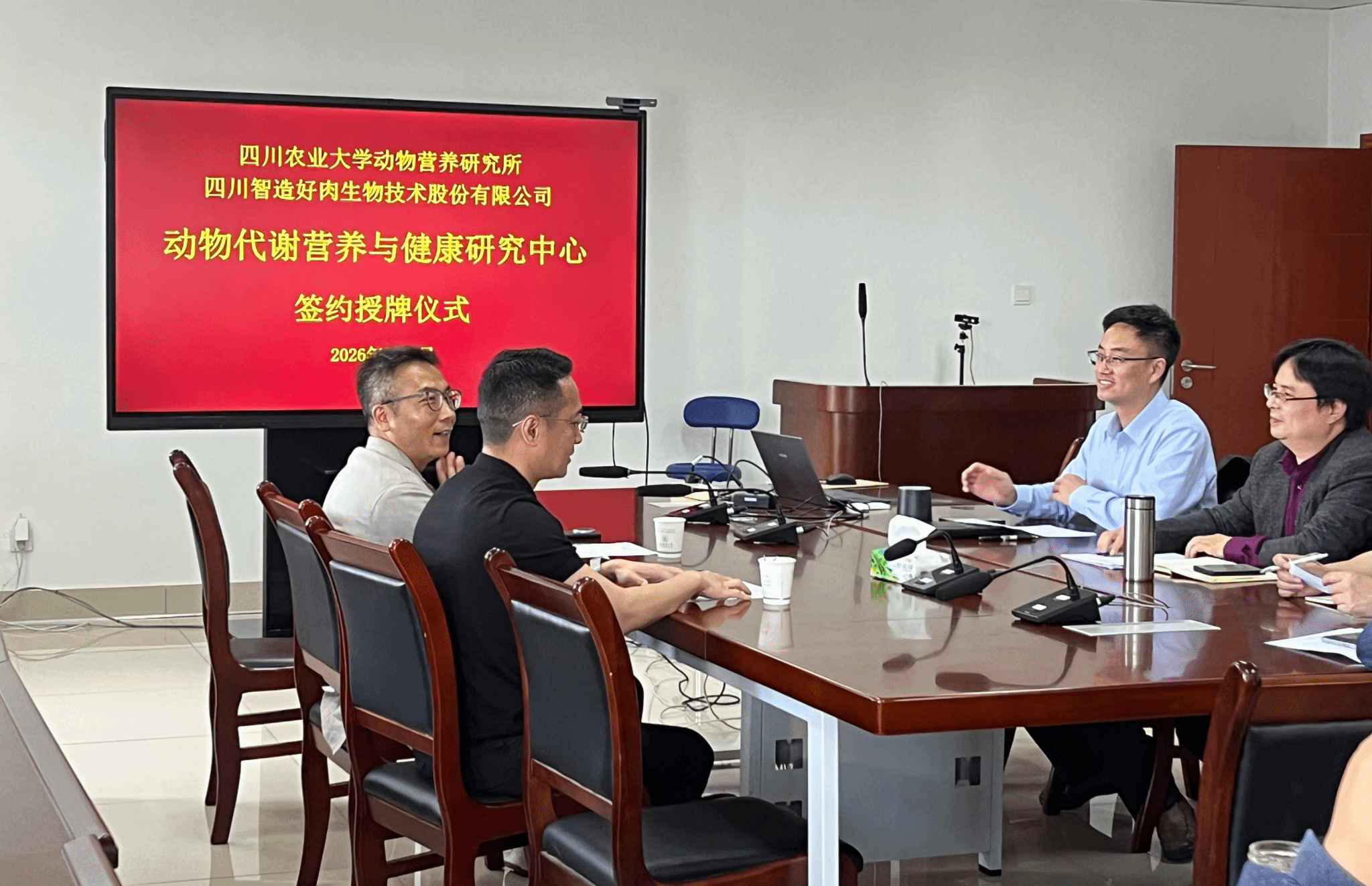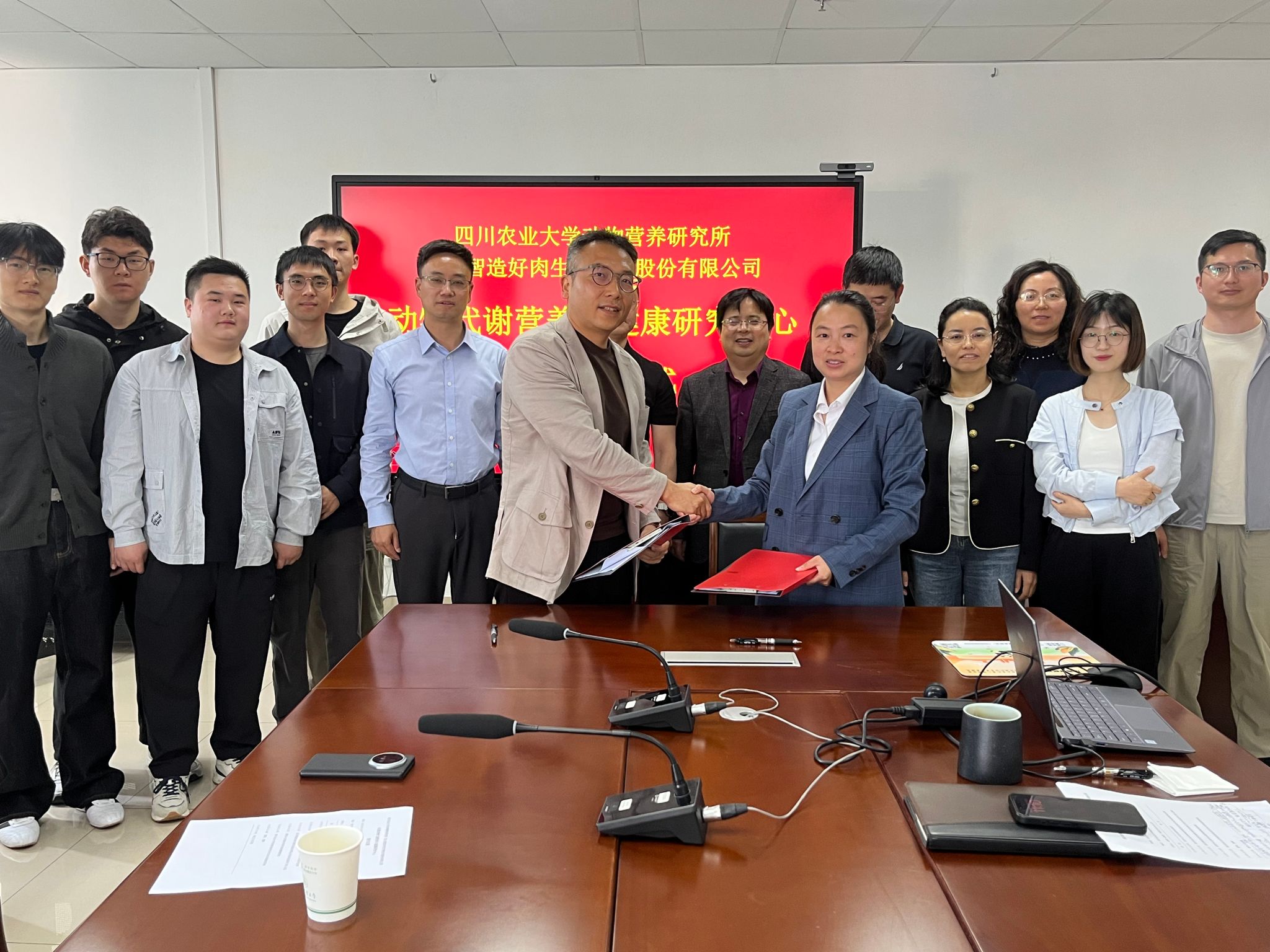 4月9日,我所与四川智造好肉生物技术股份有限公司在成都校区举行“动物代谢营养与健康研究中心”合作签约及授牌仪式,标志着双方在科技创新及产业融合方面迈出重要一步。四川智造好肉生物技术股份有限公司总经理何勇、技术总监李江博士、所党委书记钟邦胜、所长车炼强教授出席会议。签约仪式由动物营养研究所科技开发中心主任虞洁教授主持,各科室主任及部分研究生代表参会。